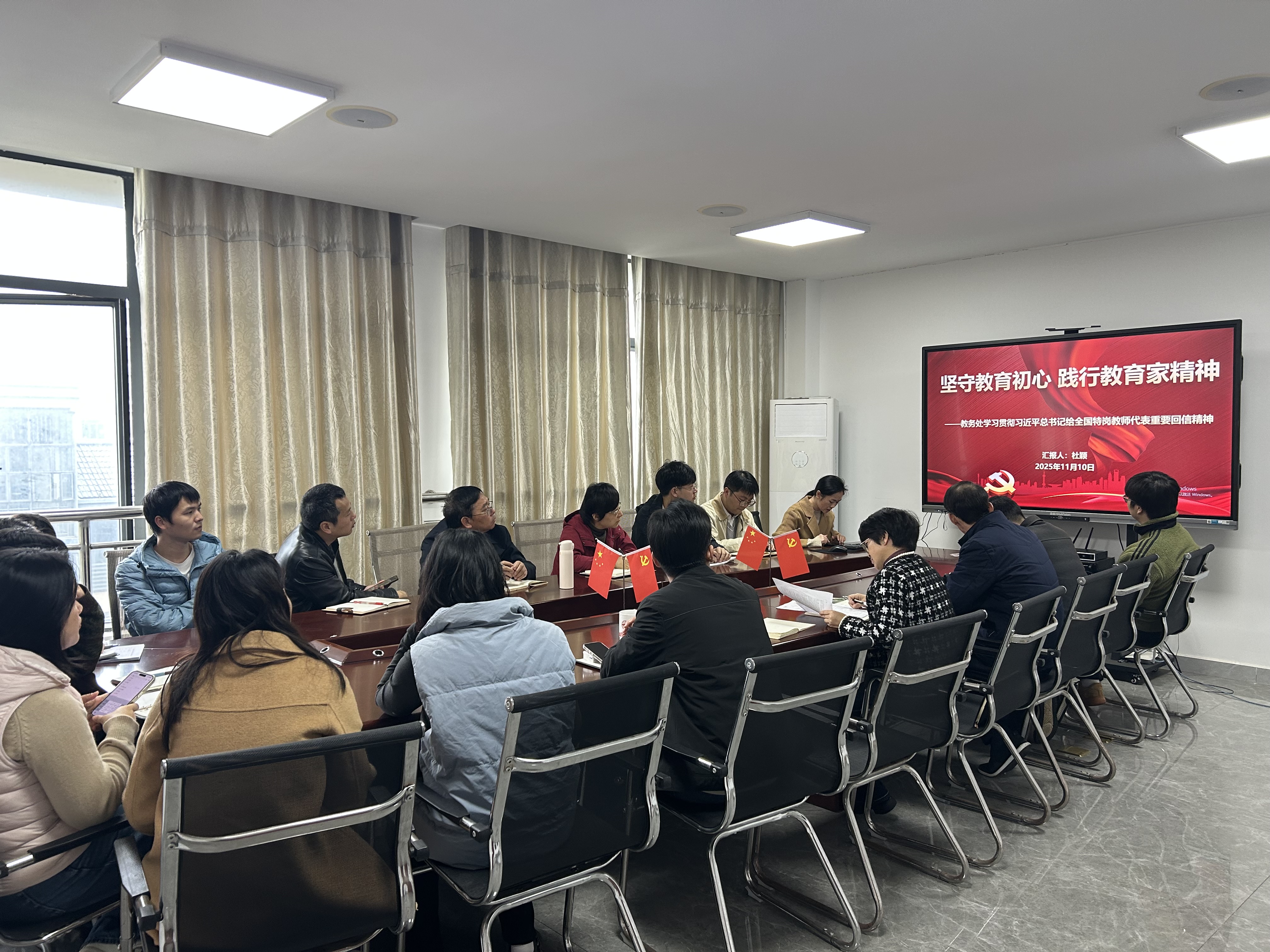 11月10日,教务处组织召开专题学习会,将警示教育、廉政教育内容与学习贯彻习近平总书记给全国特岗教师代表重要回信精神相结合,通过反面案例的警示与先进楷模的引领,教育引导部门同仁增强廉洁自律意识,提升教师责任担当。